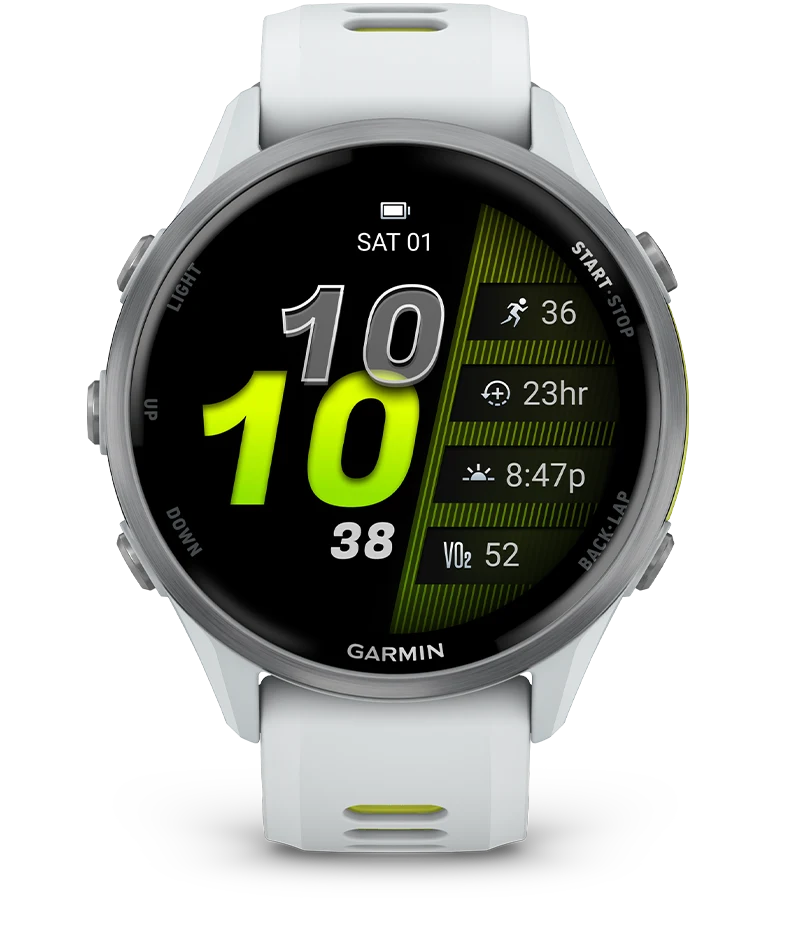 Premium GPS running and triathlon smartwatch with an AMOLED display, built-in LED flashlight and enhanced navigation plus advanced training and recovery features.